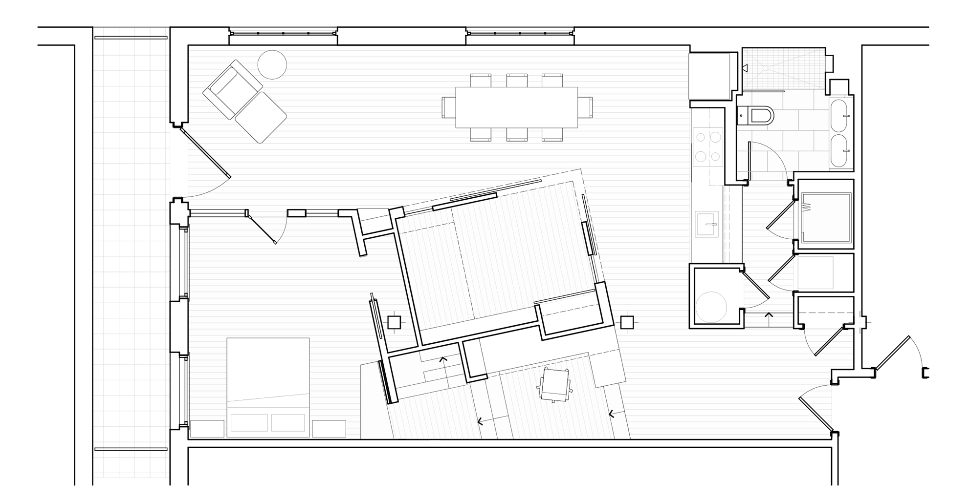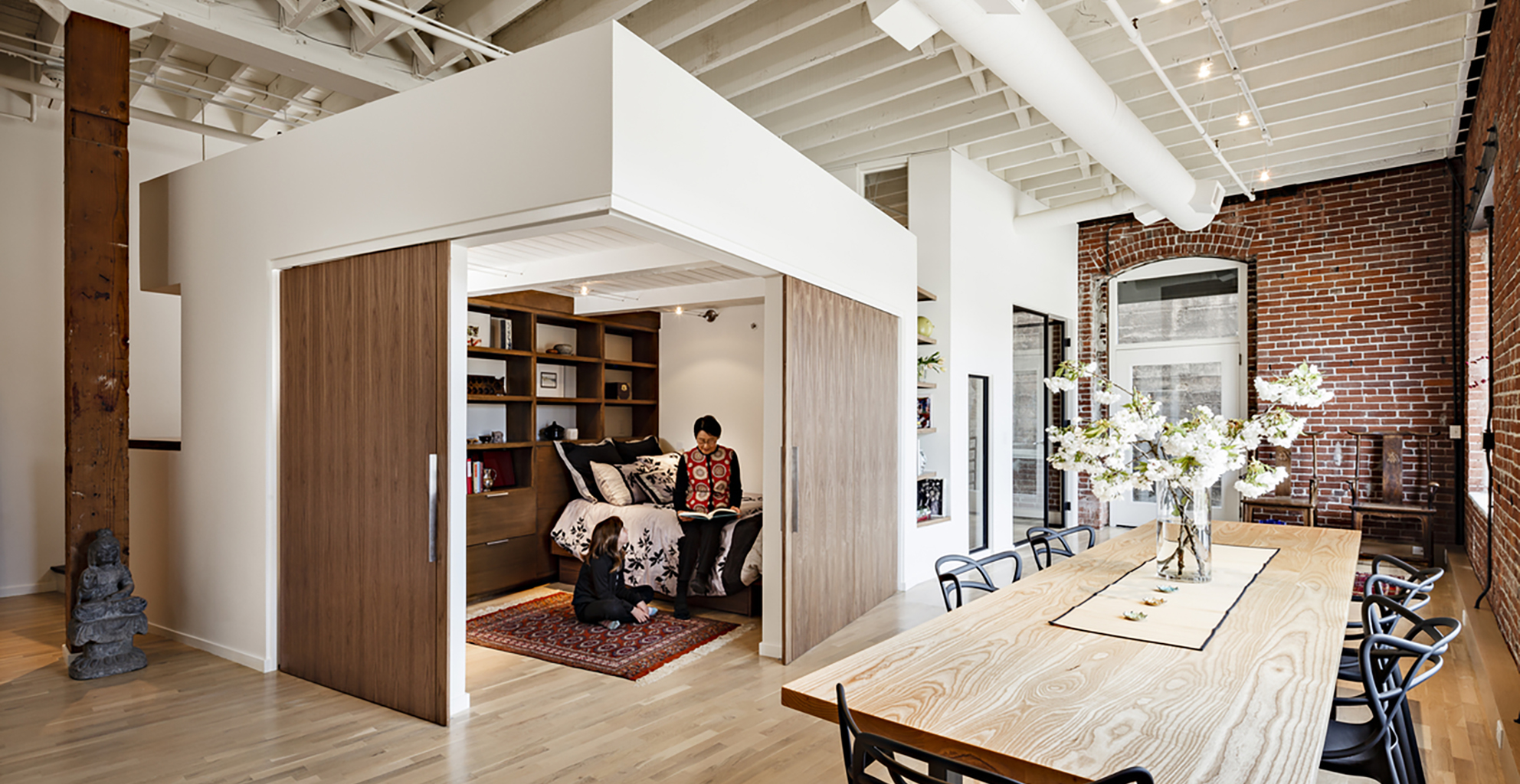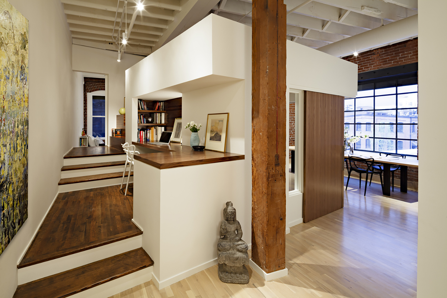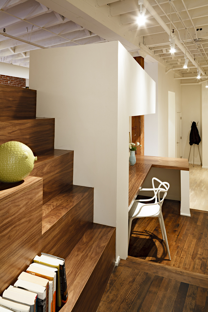 The project’s goal was straightforward: to create a new bedroom for a young girl and a flexible, private space for her grandmother. The design revolves around the grandmother’s room, which is detached from the existing walls and positioned beneath the loft’s high ceiling. The surrounding spaces are thoughtfully filled with custom casework and stairs, forming a second bedroom, a cozy library and workspace, and a loft area for storage and play.