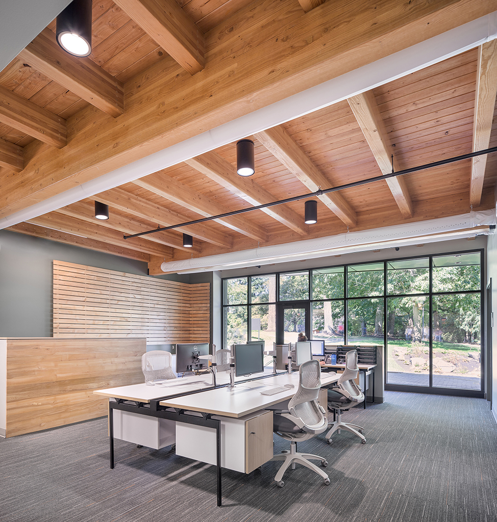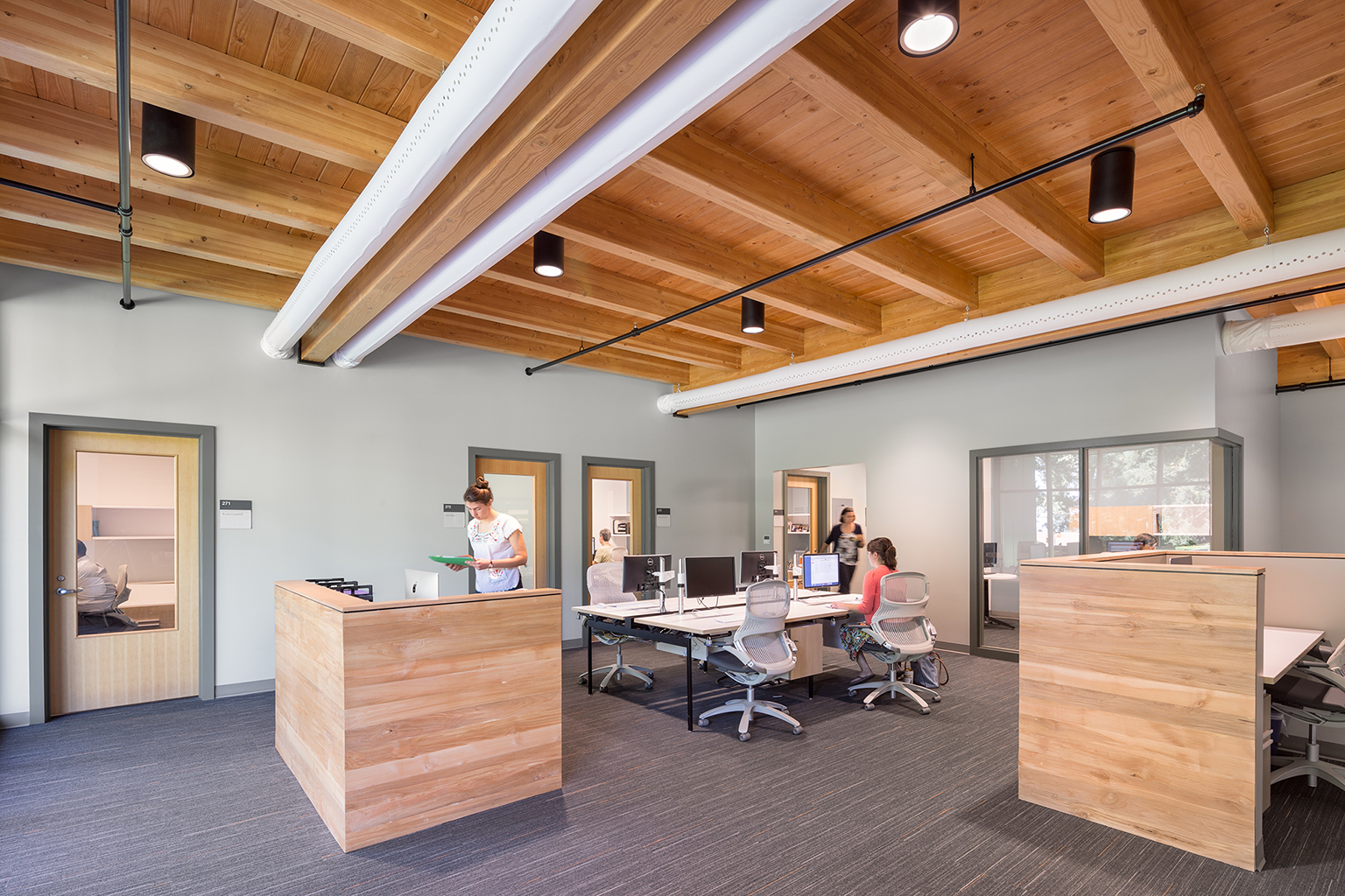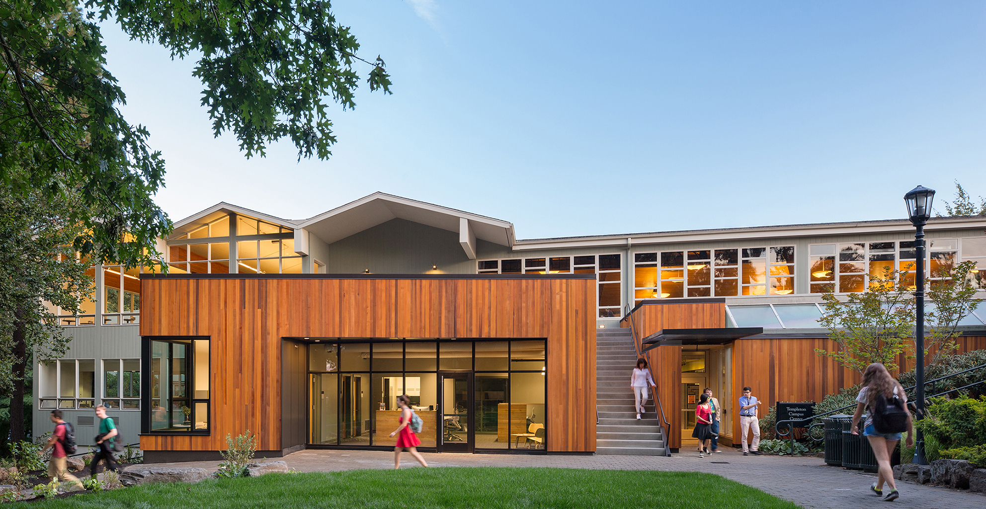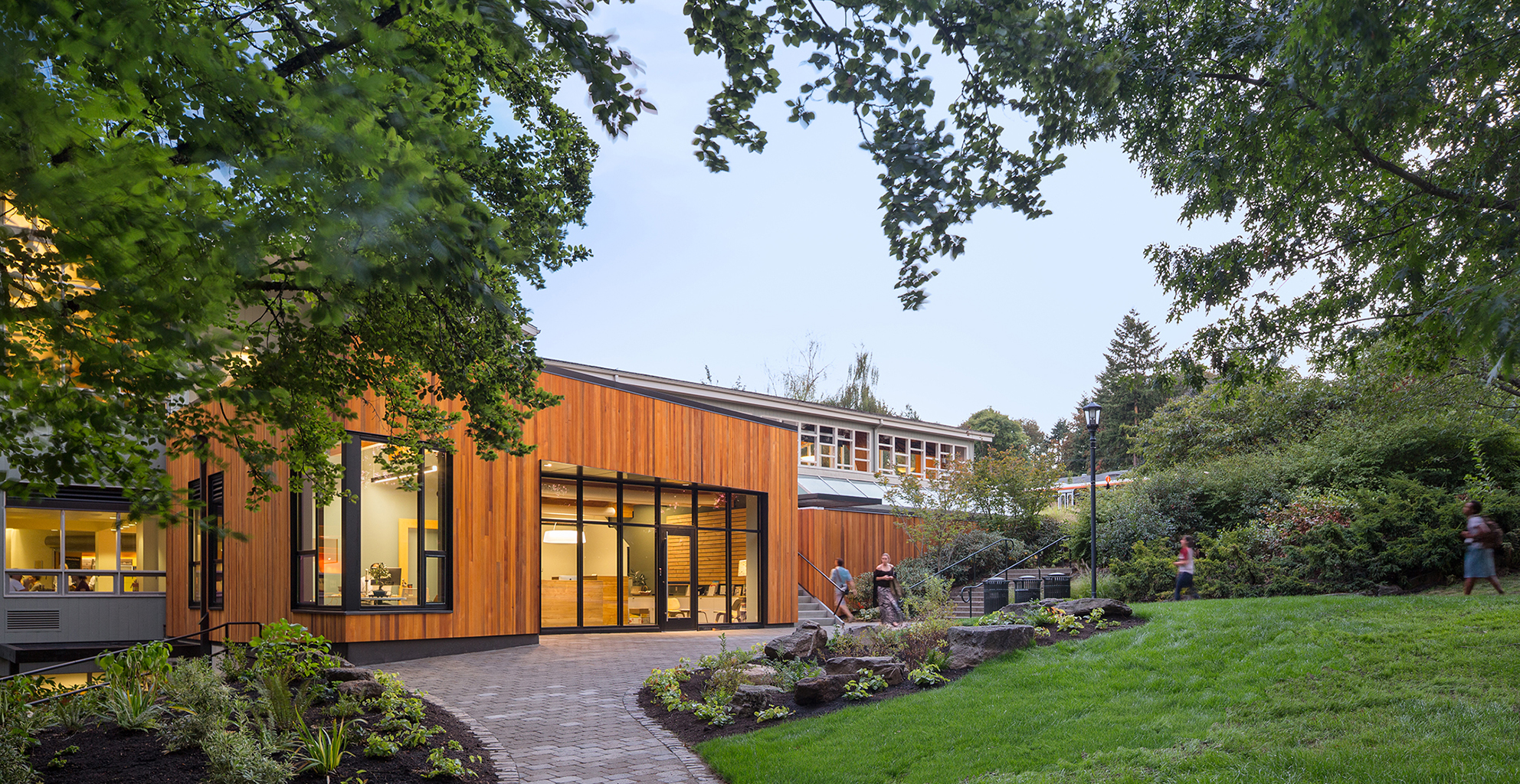 The Career Center at Lewis & Clark College is located in a cedar-clad addition to the Templeton Student Center. The ground floor features office and meeting spaces, while outdoor stairs lead to a green roof and a seating area above, adjacent to the dining hall.