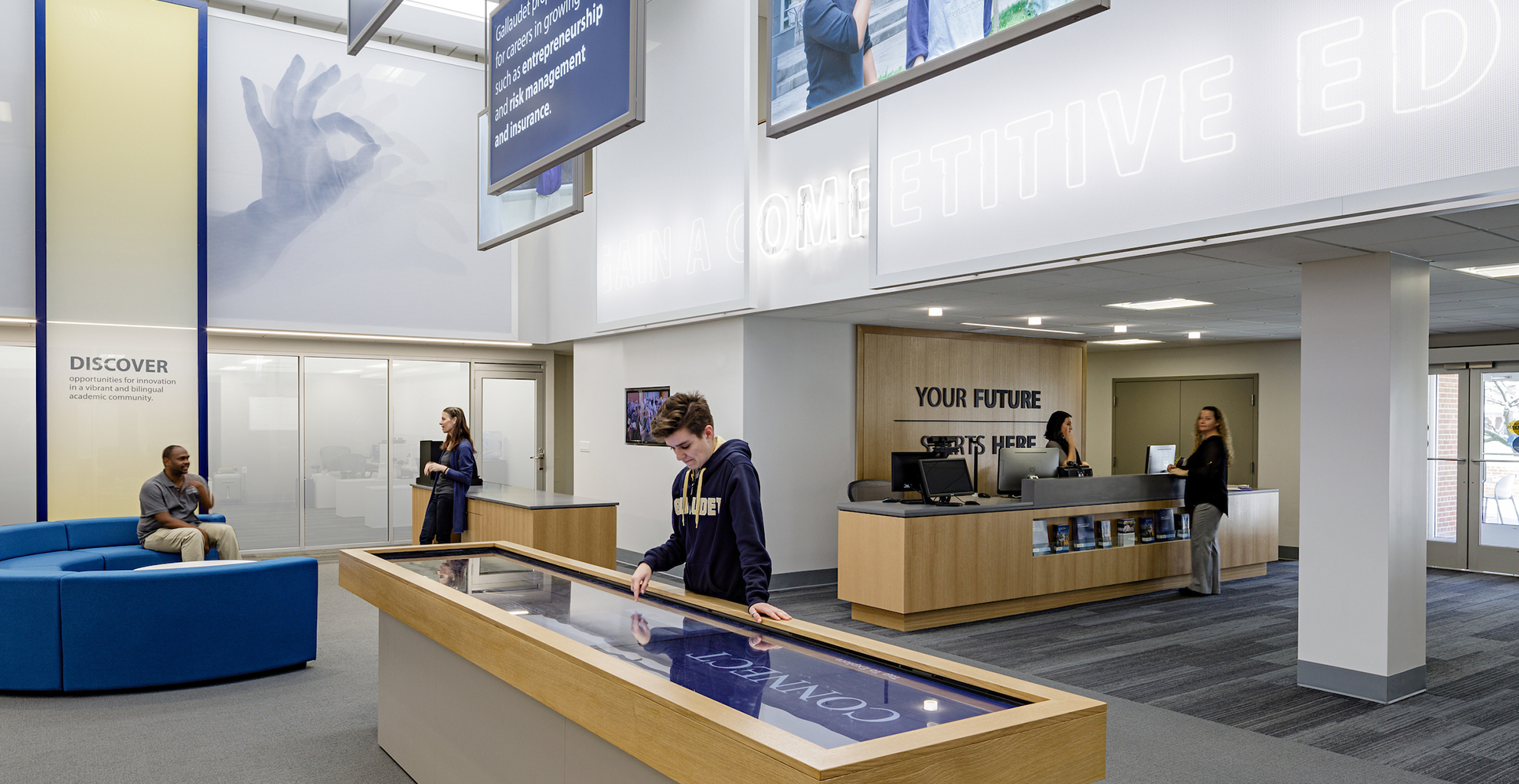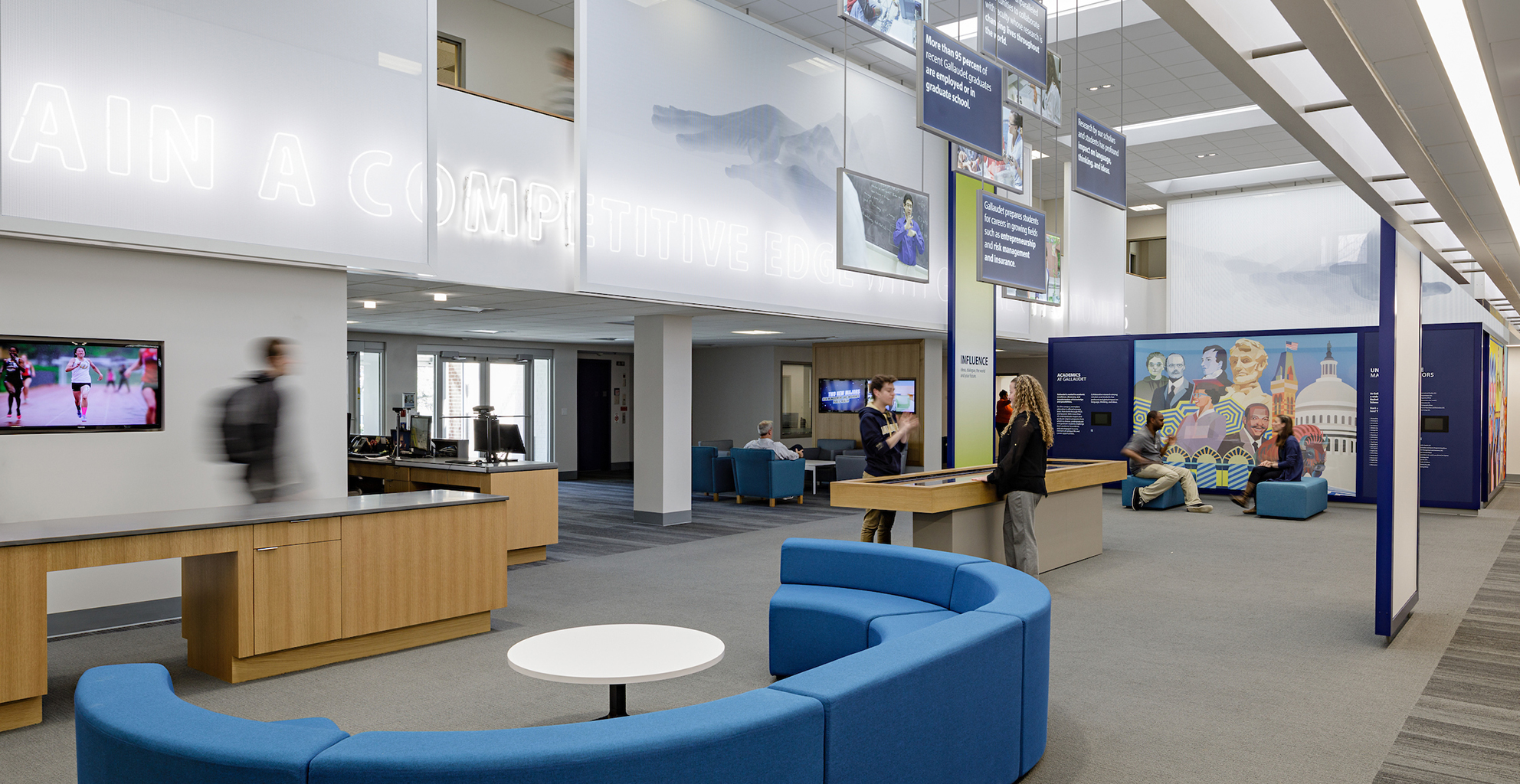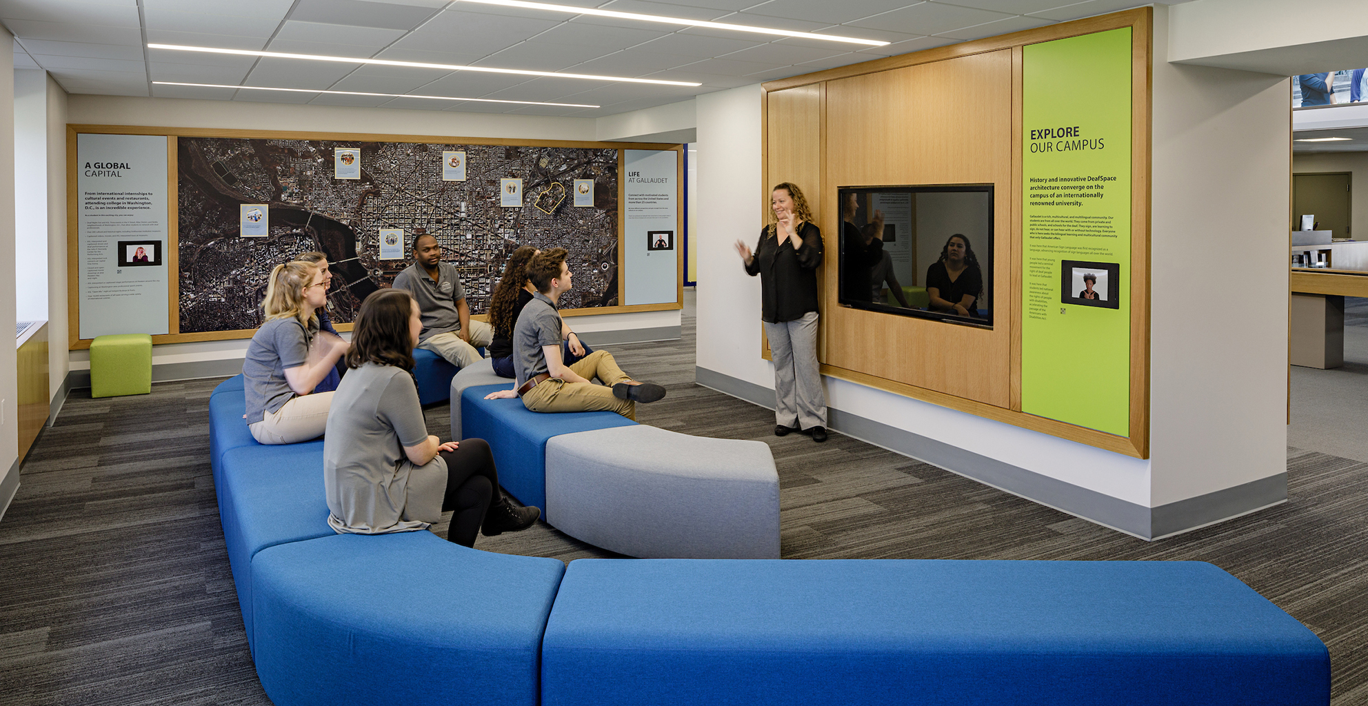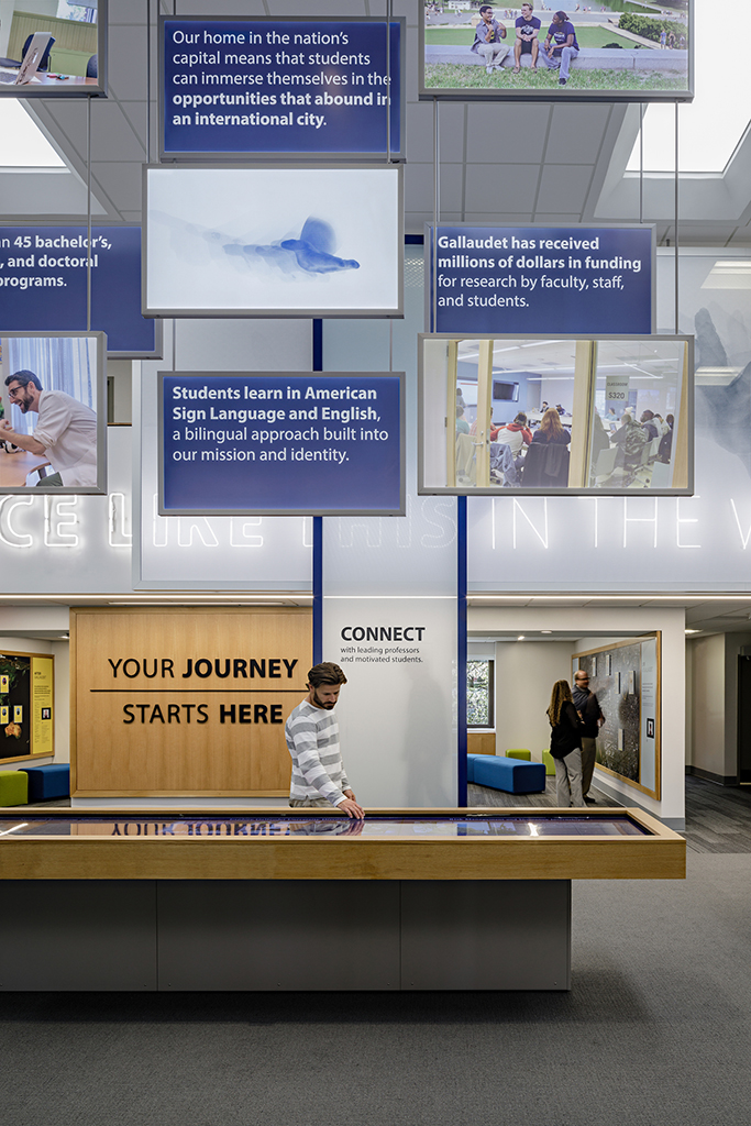 Washington, DC Each year, Gallaudet University welcomes hundreds of visitors—from prospective students and professionals to school groups and sign language classes. To enhance their experience, Bearing led a renovation of the campus visitor center, guided by the principles of DeafSpace. The redesign focused on improving visitor flow, modernizing exhibits, and establishing a new, inviting “front door” to the university—one that celebrates Gallaudet’s rich history, academic achievements, and vibrant campus life.