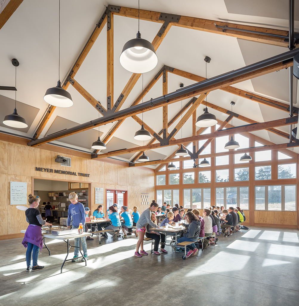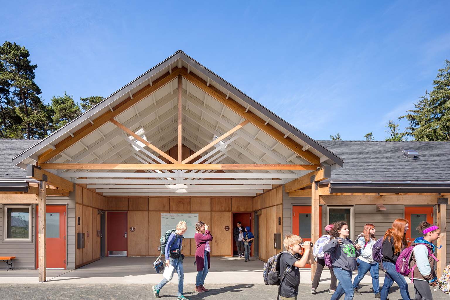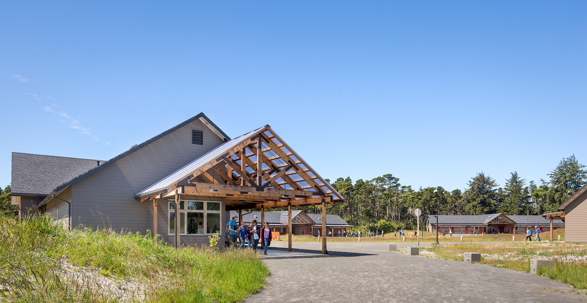 Newport, OR Nestled on 20 acres along Oregon’s Central Coast, the OMSI Coastal Discovery Center at Camp Gray offers immersive, outdoor science education for children and families. Surrounded by the region’s diverse ecosystems, the center provides hands-on learning that fosters curiosity and environmental stewardship. Its cluster of long, gabled wooden buildings draws architectural inspiration from the longhouse traditions of coastal Native American tribes and the rustic charm of early Oregon logging camps.